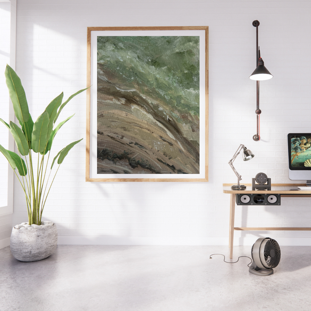 Let your space breathe with the tranquil energy of Whispers of the Sea, a textured abstract painting inspired by the meeting of land and ocean. Gentle earthy tones blend with sea greens and soft brushstrokes to evoke the feeling of waves brushing against the shore, or a cliffside kissed by the wind.
